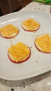Tagliate a rondelle una mela fuji, togliete la parte centrale di torsolo. Metteteci sopra una quadratino di cheddar. Aromatizzate con un po’ di miele d’acacia e spolverate con di pepe nero. Servitelo con un cabernet.