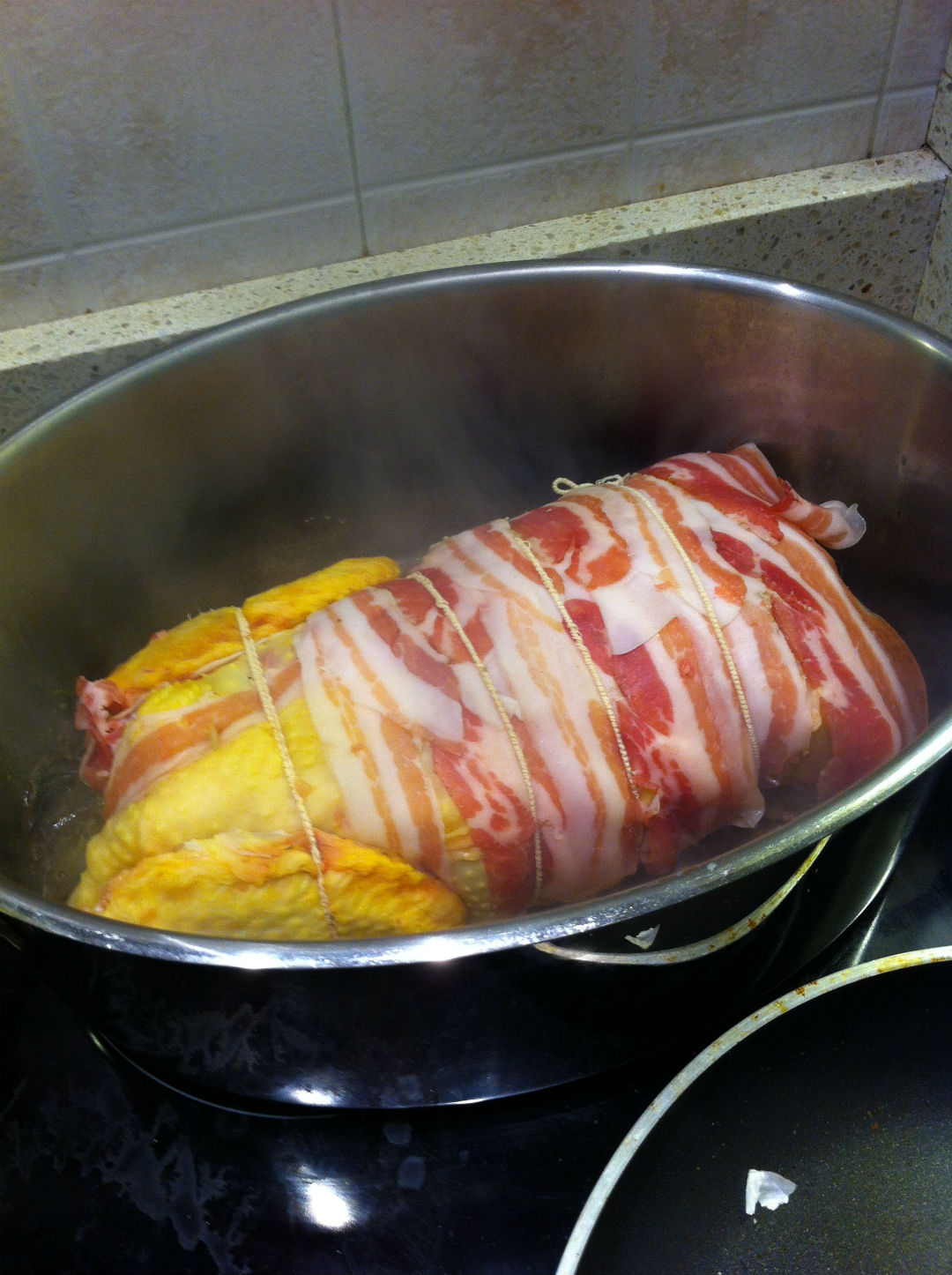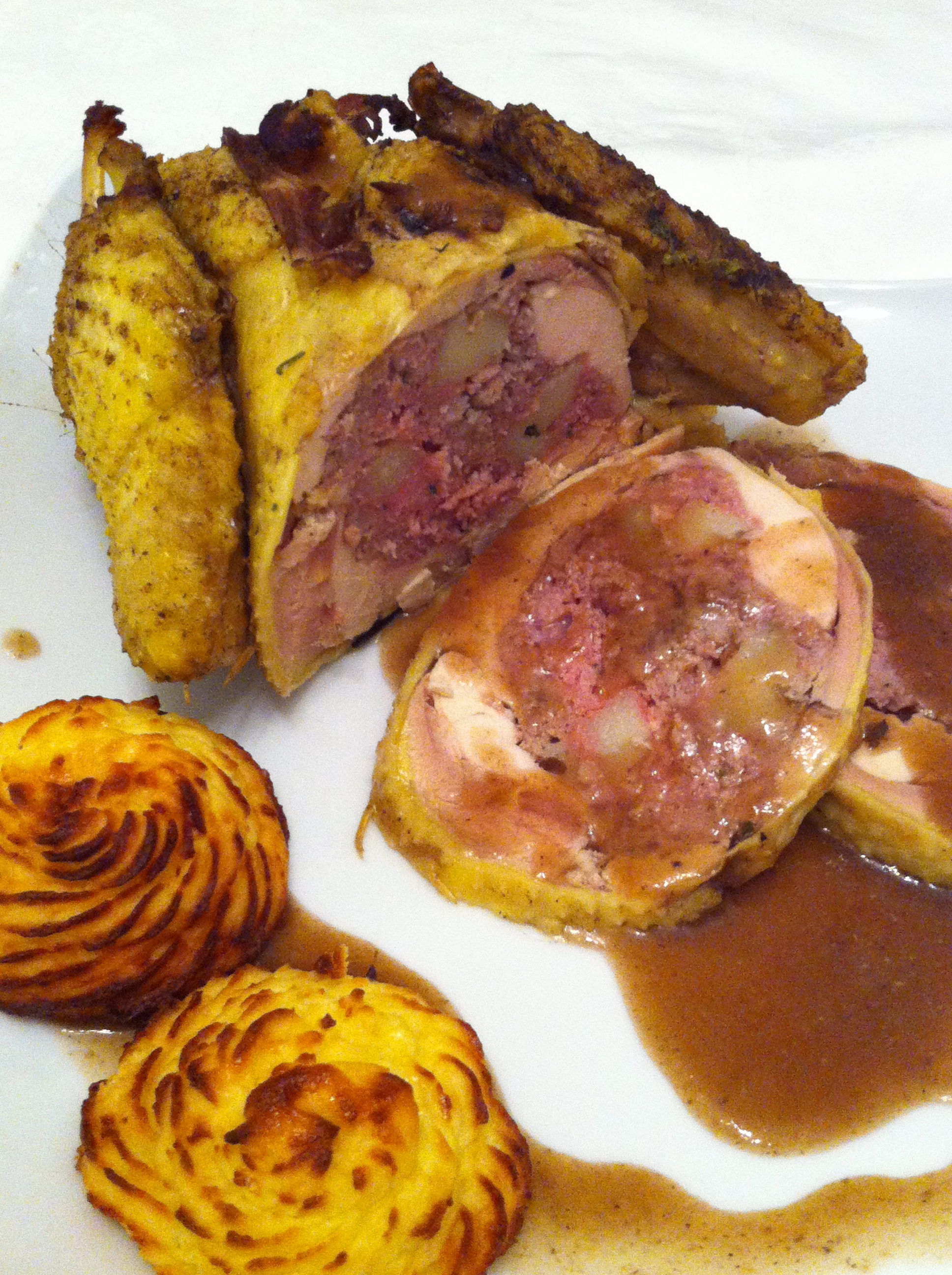 Photo 02-01-14 17 23 03Ed ecco che come ogni anno il 31 dicembre arrivano le frasi “Cosa porti per il cenone?”, “C’è qualcosa che non mangiate?”, “Poi dividiamo la spesa”. Nell’ outing che si era creato con ognuno che diceva la sua, io avevo timidamente detto “Porto le lenticchie e qualche antipasto se vi va”. Ovviamente andava. Ma prima che potessi scrivere un appunto su un foglietto volante a mio marito si è accesa una lampadina ” Fai il tuo cappone ripieno!”. E a quel punto, avevamo fatto 30, facciamo 31! Ci ho inserito anche delle patate duchessa d’accompagnamento.