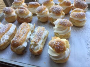 For the filling, use whipped cream or chocolate ganache. Chocolate ganache is a mixture of equal weights chocolate and cream, melted together.  The simplest recipe is 200 gr chopped chocolate whisked with 200 gr cream until totally combined and shiny. Let it cool. Whip the liquid ganache until it’s soft and solid to be used to fill the puffs.