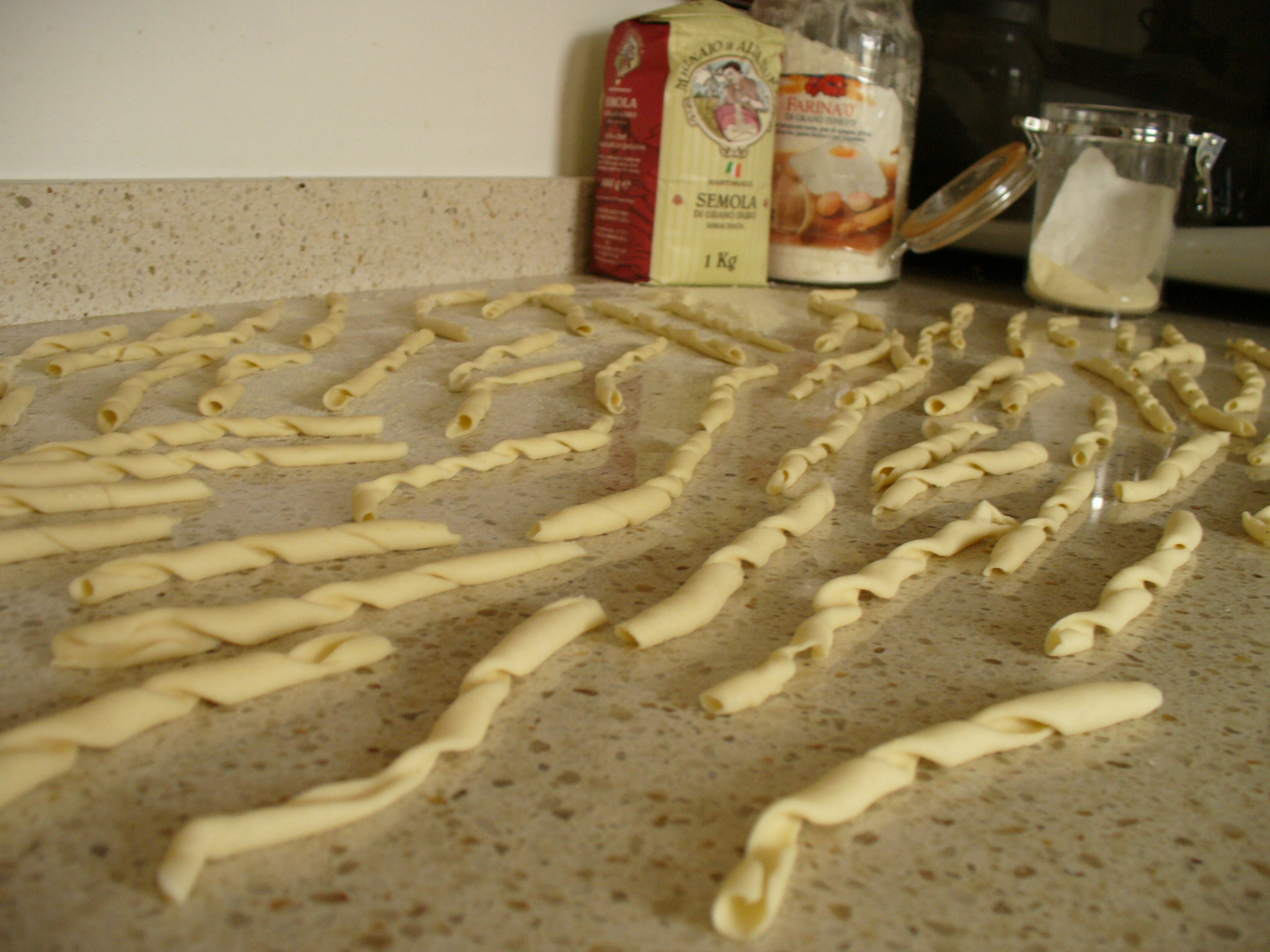 minuti. Si fanno dei salamini di circa 10-12 cm di lunghezza (calibro 2-3 millimetri) e si attorcigliano attorno al ferro. Con cautela si fa rotolare il ferro avanti e indietro tra il palmo della mano e il piano di lavoro (attenzione a non infarinarlo troppo altrimenti non rotolano). Si sfila il ferro e il maccherone è fatto.