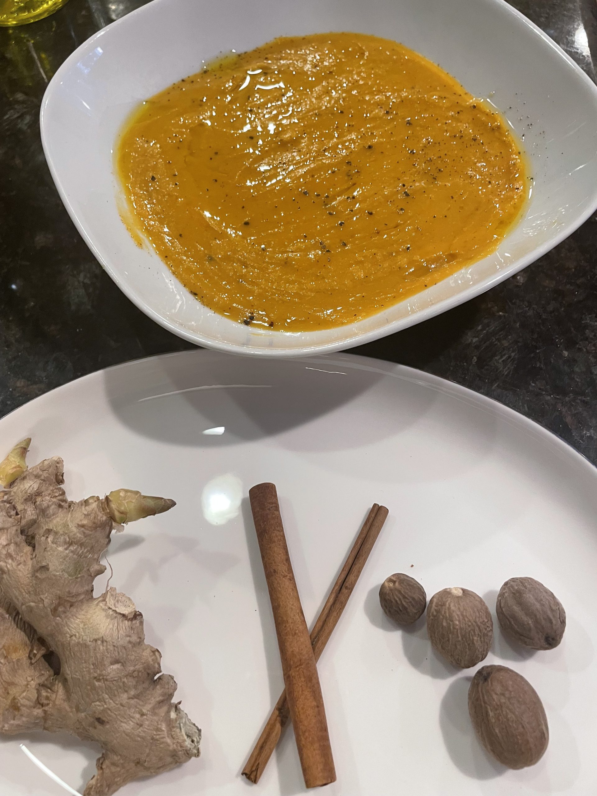Per caso, leggendo uno dei miei libri di cucina, ho letto l’abbinamento zucca-zenzero. Non vado pazza per la zucca, ma ho imparato ad adorare lo zenzero. Lo aggiungo nel succo d’arancia, nella salsa di soia, nei biscotti, nel the. Perche’ non provarlo anche con la zucca? Poi ho pensato che potevo aggiungere anche altre spezie come la noce moscata e il pepe. Poi, spostando barattoli di spezie ho visto la cannella. Ma si dai, una puntina non fare’ male….ed ecco da dove e’ nata questa crema di zucca.